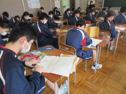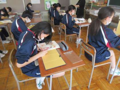 3年生の美術の授業は『「和」の心』。屏風画について,実物大の下描きを完成させていました。