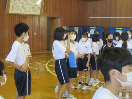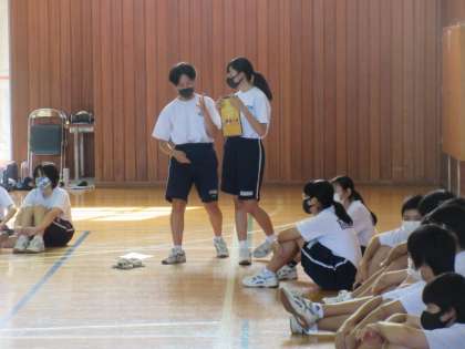 1年生の体育祭練習の様子。各団に分かれ,団体種目のグループ分けをしていました。実行委員が中心となって活動していました。