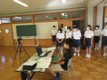 前期・後期切換,体育祭結団式 公開日 2021/10/11 更新日 2021/10/11 お知らせ 1校時に,オンラインによる前期・後期切換への校長の話の後に,体育祭結団式を行いました。各クラスに配信される式で,実行委員が創り上げた式です。