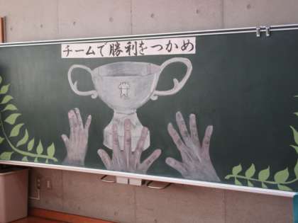 体育主任の寺田先生からの話。短い練習期間であると心配していましたが,先週の各学年の実行委員の生徒の動き,実行委員の話を聞く各学年の生徒の真剣さに感動しましたというお話がありました。後には美術部が仕上げた黒板アートが光っていました。限られた時間で,精一杯頑張ろうとする気運が,学校全体に広がっています。