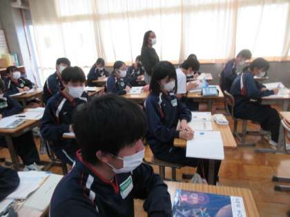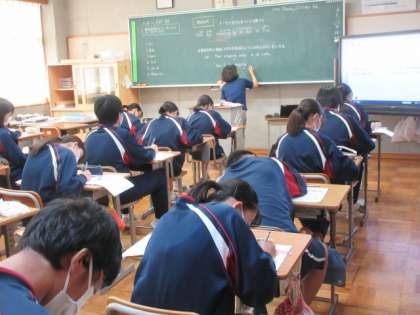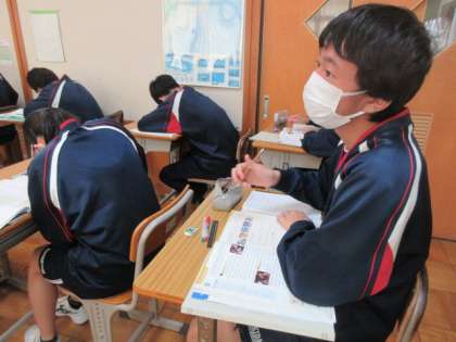 3年生の英語の授業の様子。皆真剣に板書をノートにとって考えていました。