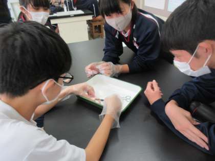 2年生の理科の授業は骨格について。関節の構造について,手羽先を実際に分解して確認していました。