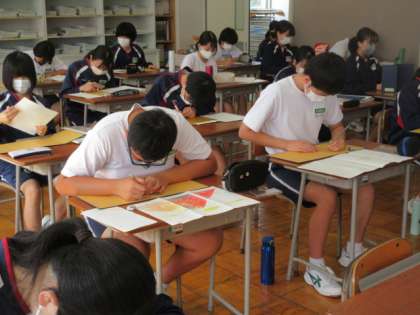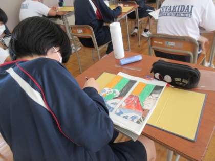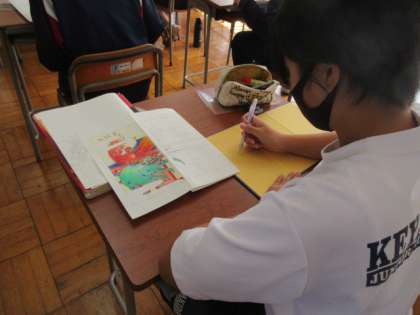 3年生の美術の授業は,卒業制作。屏風絵をいよいよ描いていきます。皆真剣に取り組んでいました。