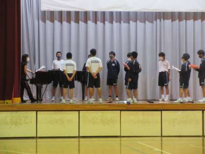 1年生の音楽の授業は,合唱練習。体育館で密を避けながら練習を重ねていました。