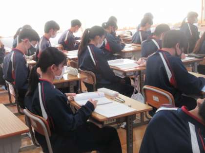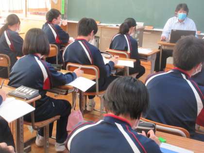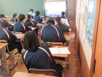 3年生の数学の授業は,相似に関する問題への取組。電子黒板に映し出された図形を皆で解いていきます。
