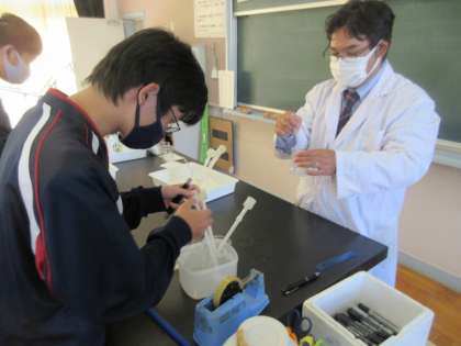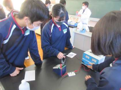 3年生の理科の授業は実験。電解質水溶液について調べていました。