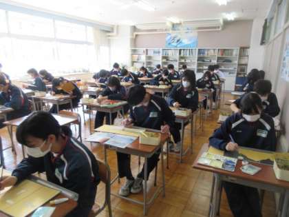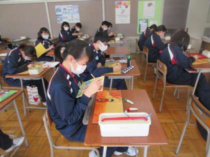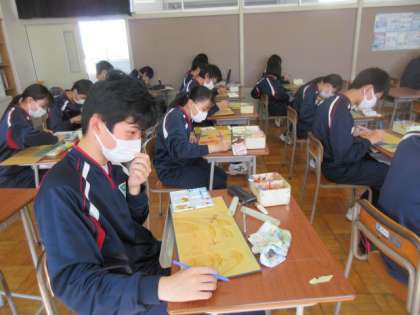 3年生の美術の授業は,屏風絵制作。皆真剣に取り組んでいました。