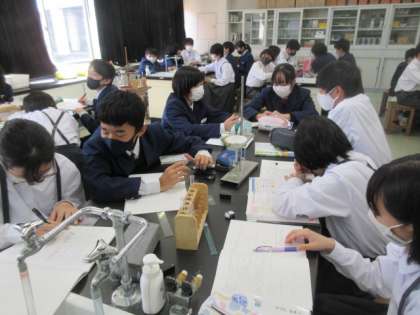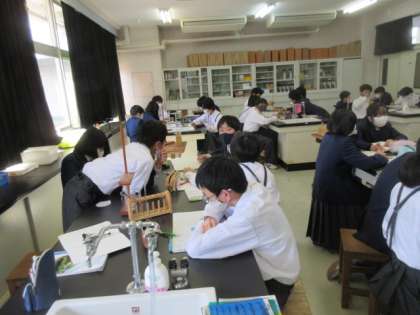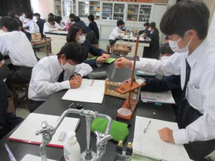1年生の理科の授業は,ろ過の実験のまとめ。塩化ナトリウムの結晶も作りました。操作方法についての確認も行われていました。