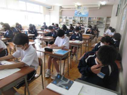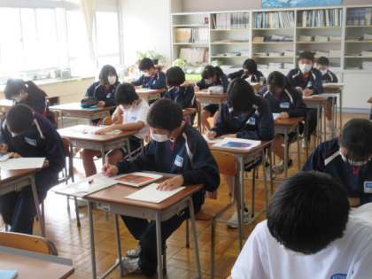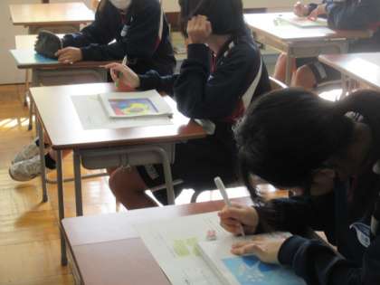 1年生の美術の授業は,色について。色彩を考えながら作製した作品に,名前を付けていました。