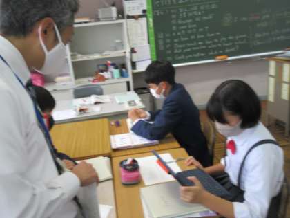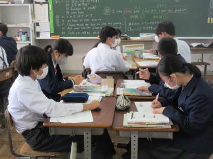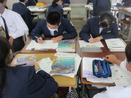 2年生の英語の授業は短文英訳。ワークシートを用いて進めていました。