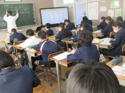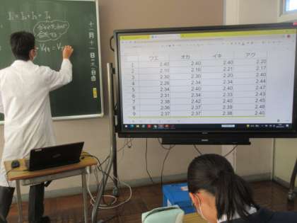 2年生の理科の授業は,電流・電圧の実験結果のまとめ。このまとめをしっかりとした後に,オームの法則の学習が始まります。皆集中して取り組んでいました。