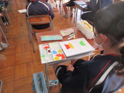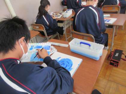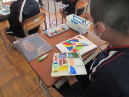 1年生の美術の授業は,色について。皆、作品の制作に集中していました。