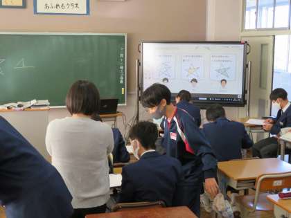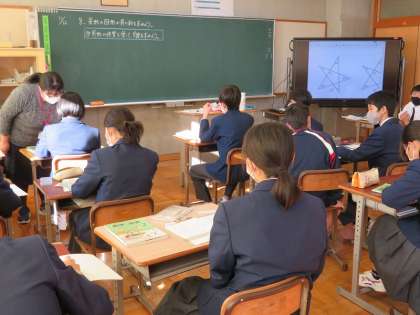 2年数学は,少人数に分かれ,星形の先端の角を集めたら何度になるかを,いろいろな方法で考え,周りの友人と相談したりしながら,解決しようとしていました。