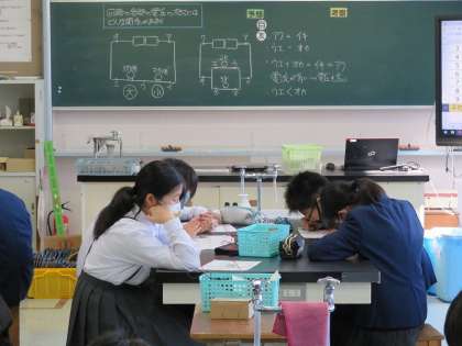 回路の各部の電圧大きさをについて,予想した後実際に回路をつくり,実験して調べていました。また調べた結果から分かったことを,班ごとにまとめていました。