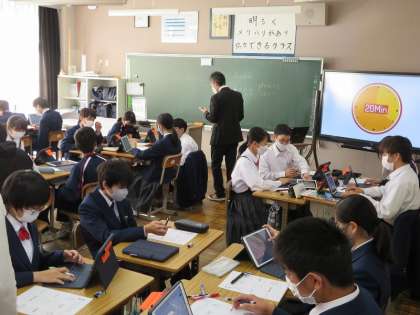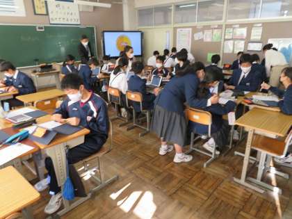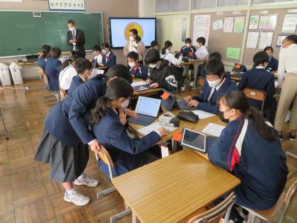 英単語をパズルにして,組み合わせを,タブレットで調べたり,周りの友人と相談しながら,ワークシートを完成させていました。