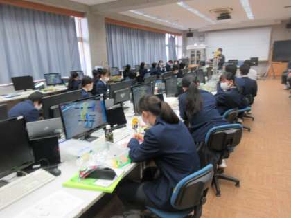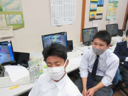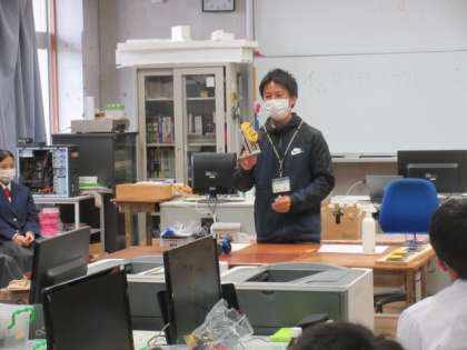 3年生の技術の授業は,電動の荷物を持ち上げる装置について。エネルギーの変換とプログラミング教育の2つの観点が含まれています。生徒は真剣に先生の説明を聞いていました。