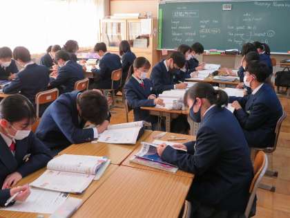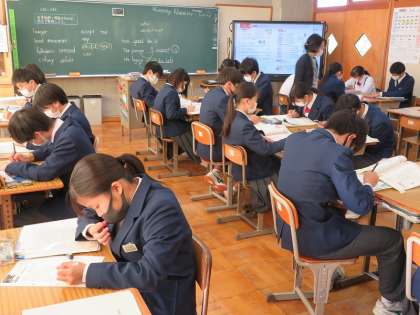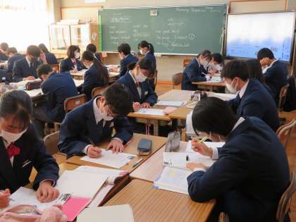 「後置修飾と関係代名詞の用法を整理しよう」という課題で,グループをつくり,相談したり,調べたりしながらワークシートにまとめていました。