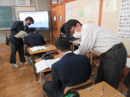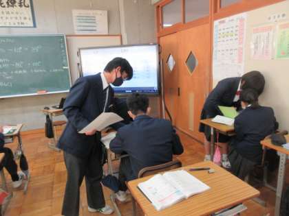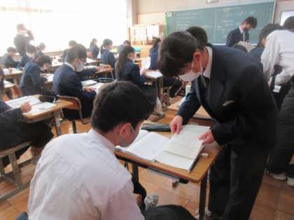 3年生の理科の授業はイオンの化学式について。プラス,マイナスの電気を帯びた原子の結び付き方について,教え合っていました。