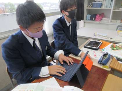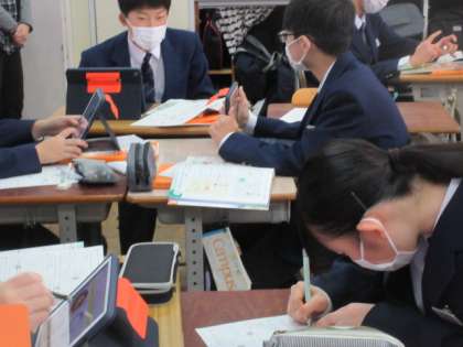 2年生の家庭科の授業は献立作り。タブレットを使いながら,栄養面に配慮して考えていました。
