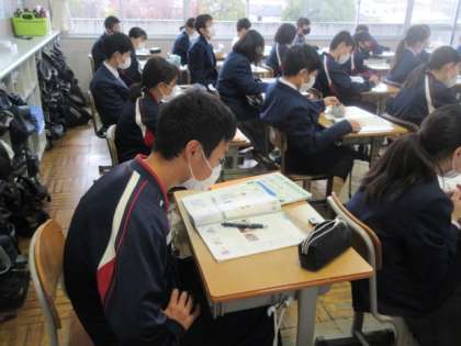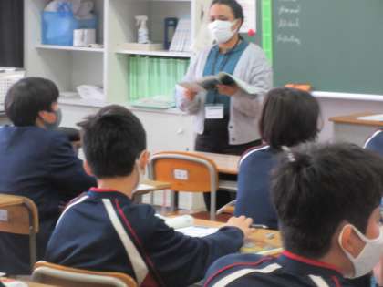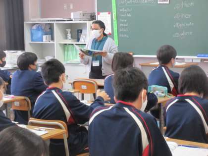 1年生の英語の授業は発音練習。ジュニ先生の後に続き,練習をしていました。