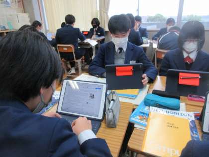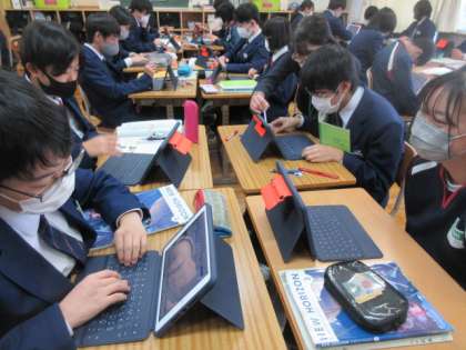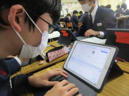 3年生の英語の授業。タブレットを用いての単元末テストです。皆真剣に取り組んでいました。