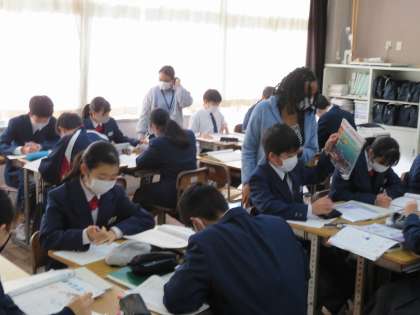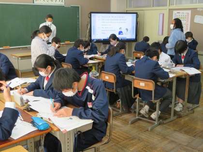 本文の内容を確認しながら,長いつづりの比較級や最上級について,ワークシートにまとめていました。