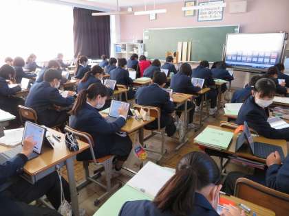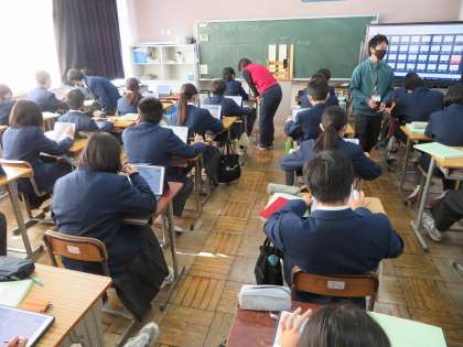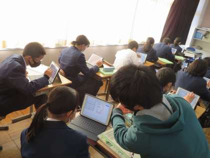 タブレットを使い,設計図を作成していました。立体を平面に表すのに,数学で学習したことを参考に,組み立てていました。