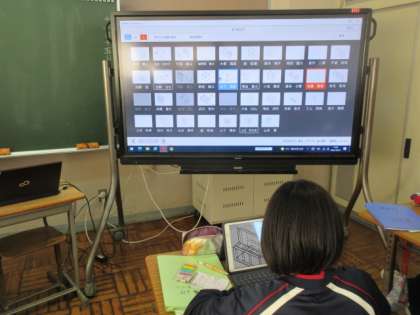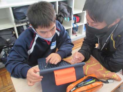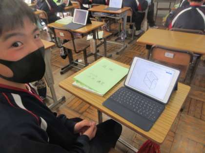 1年生の技術の授業は,木工製作の構想図作成。タブレットを用い,自分の工夫を実物にすべく,図を作成していました。電子黒板で,全員の構想図を写して,共有していました。