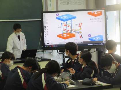 2年生の理科の授業は,モーターの原理について。電子黒板の模式図で,フレミングの左手の法則を当てはめながら動きを確認していました。
