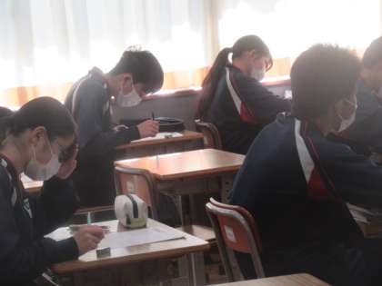 3年生の数学の授業は応用問題への取組。受験の本番を控え,気合いが入っていました。