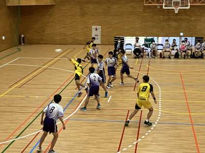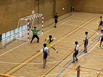 男子ハンドボール決勝戦は千代田中学校との対戦です。前半7対6で1点リードです。両者1歩も引かずの接戦です。