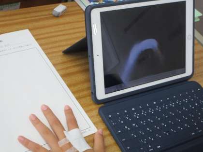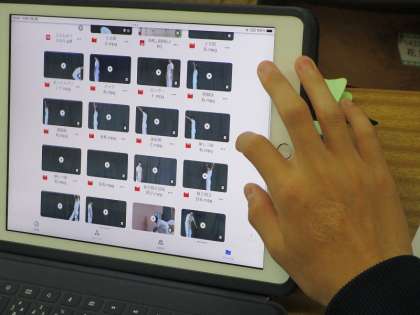 1年生の体育の授業の様子です。マット運動の導入として、iPadを活用して技の種類や特徴を学びました。