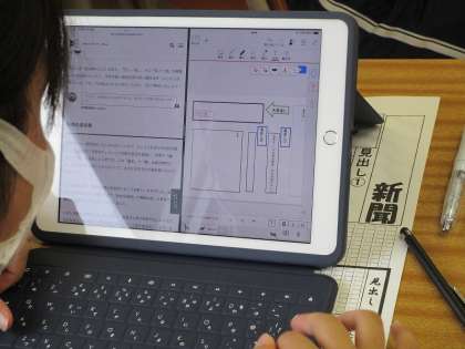 3年生の国語の授業の様子です。自分が調べた和歌の歌意や心に引かれたことを伝え合うために、新聞に作成しました。