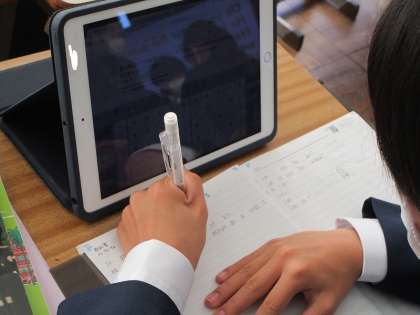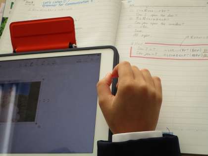 1年生の英語の授業の様子です。「紹介したい人を代名詞をもちいて4〜5以上の英文で紹介しよう」をテーマに、メタモジを活用して英文を作りました。