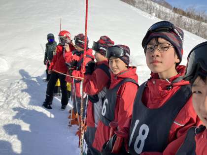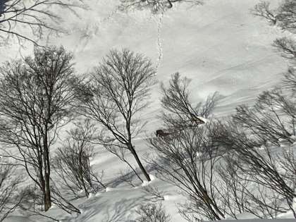 雪山にカモシカがいました。1年生がカモシカを見つけて喜んでいます。さて皆さんどこにいるかわかりますか?