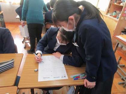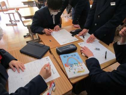 3年生の数学科の授業の様子です。ワークシートを使った復習を行っています。仲間と協力しながら難問を解決しています。