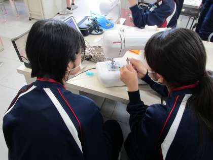 1年生の家庭分野の授業の様子です。ミシンを使って自分で決めた小物を作ろうをテーマに、仲間と協力しながらミシン縫いを行っています。