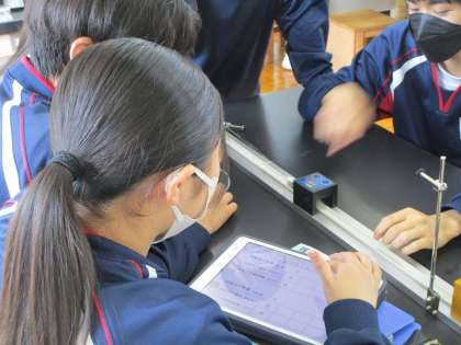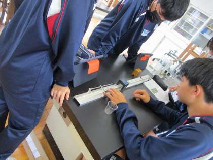 3年生の理科の授業の様子です。運動エネルギーの大きさは、何に関係しているのだろうかについて、実験をとおしてこたえを見つけ出しました。