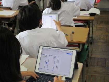 1年生の国語の授業の様子です。三吉と親方はそれぞれどんな人物だと読み取れるかをテーマに、根拠となる表現、人物像をメタモジワークシートにまとめました。