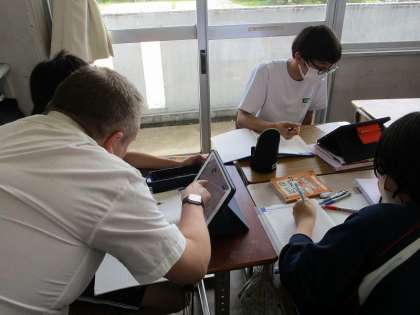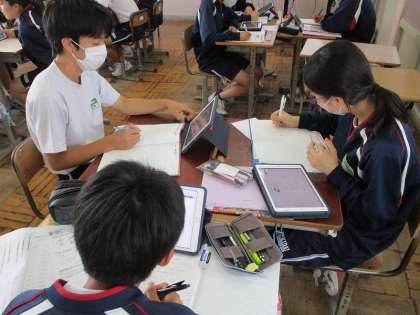 2年生の英語の授業の様子です。単元の確認の学習です。メタモジワークシートを使いながら学習を進めました。