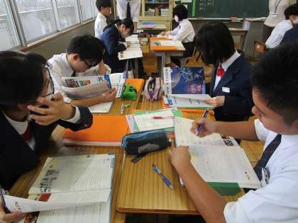 3年生の英語の授業の様子です。「南アフリカ」と「インド」のどちらかの出来事かを、グループで話し合いました。