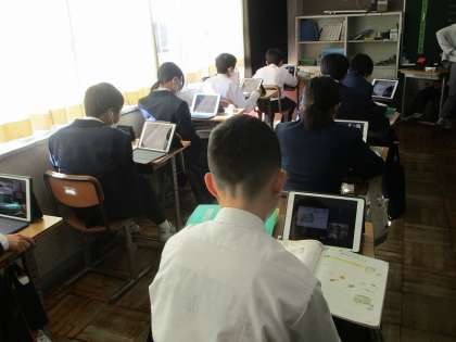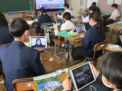 1年生の英語の授業の様子です。オンライン英会話の時間です。相手の体調についてたずねたり、自分の体の不調について説明したりすることができるをテーマに、学習を進めました。