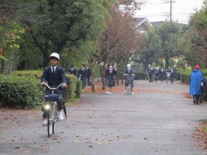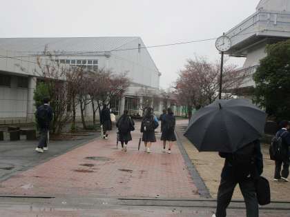 今朝の登校の様子です。心配された雨の影響もなく、傘なしで登校する生徒も多くいました。