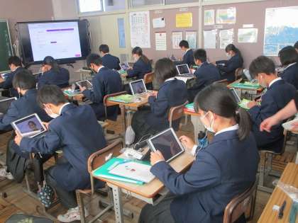 1年生の英語の授業の様子です。オンライン英会話の時間です。相手の体調についてたずねたり、自分の体の不調について説明したりすることができるをテーマに、学習を進めました。