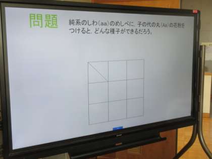 3年生の理科のオンライン授業は遺伝について。チャット機能を使って先生から出された問題に解答し,共有していました。