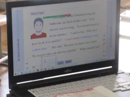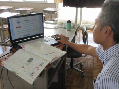 2年生の英語のオンライン授業。教科書に載っている文を,一つ一つ確認していました。