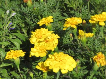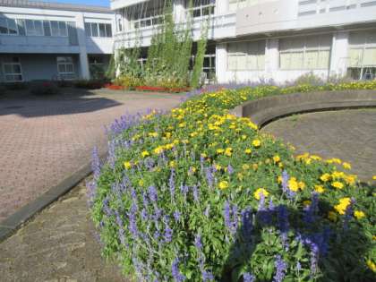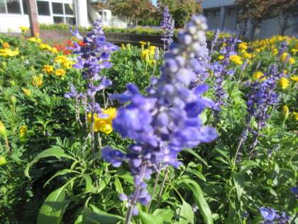 中庭の円形花壇のブルーサルビア,マリーゴールドが大きく生長しました。秋本番で,ピークは過ぎてしまいましたが,生徒が登校できる日までは,花壇を彩ってほしいと願っています。