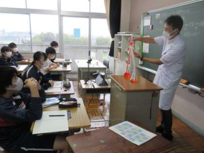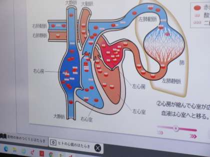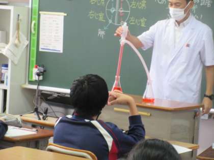 2年生の理科の授業は心臓について。ポンプ内の弁の動きを見て,血液の送り方について確認していました。オンラインでも配信していました。
