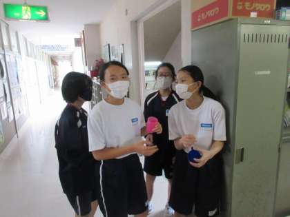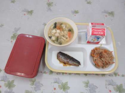 給食の時間。生徒は手洗いと歯磨き時用の水をくんでいました。今日の献立は,イワシの生姜煮,切り干し大根の炒め煮,サトイモのおみそ汁です。