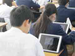 2学年全4クラスでオンライン英会話が行われました。画面を見ながら、外国の方と言葉を交わしています。いろいろな声が聞こえてきます。